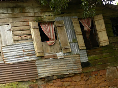 This is a quick fix...an organisation from somewhere are trying to get the people to repair the houses with wood instead of the galv iron...but they are on an uphill battle...it is so much easier to beat the iron flat and nail it to the existing wood...sad becasue the board houses are becoming more and more decrepit. In earlier times the locals used to repair the old wood regularly..I suppoes that the quick fix is as a result of the war...nobody cares any more!